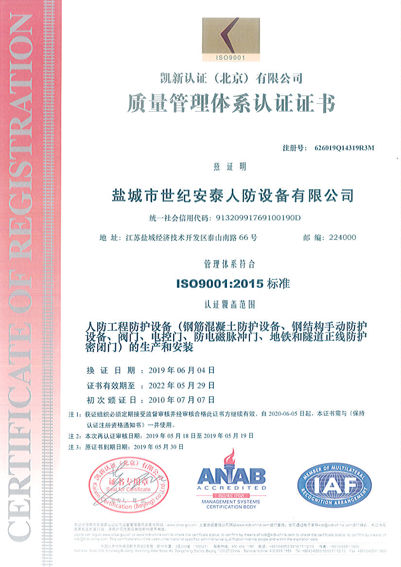 鹽城市世紀安泰人防設(shè)備有限公司是國家人民防空辦公室批準成立的人防工程防護設(shè)備定點生產(chǎn)和安裝企業(yè),是專業(yè)生產(chǎn)、銷售、安裝人防防護設(shè)備產(chǎn)品的企業(yè),公司主要生產(chǎn)鋼筋混凝土防護設(shè)備、鋼結(jié)構(gòu)手動防護設(shè)備、閥門、電控門、防電磁脈沖門、地鐵和隧道正線防護密閉門等各類產(chǎn)品并對產(chǎn)品進行安裝、調(diào)試、維修及保養(yǎng),公司生產(chǎn)的各種規(guī)格的人防工程產(chǎn)品,均按國家人防總參工程兵四所及中國建筑標準設(shè)計研究院提供的圖紙生產(chǎn),符合各種人防工程設(shè)計要求,是各類地下人防工程選用的理想產(chǎn)品。本公司已通過GB/T19001-2008IDT ISO9001:2008國家質(zhì)量體系認證。
